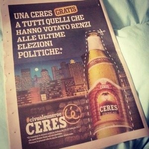 La birra Ceres prende in giro chi ha votato Renzi, in una pubblicità Cronaca Italia La birra Ceres prende in giro chi ha votato Renzi, in una pubblicità admin Ottobre 28, 2015 La birra Ceres prende in giro chi ha votato Renzi in una pubblicità . «Birra gratis a tutti...Read More