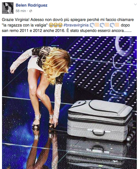 “Grazie Virginia! Adesso non dovrò più spiegare perché mi faccio chiamare “la ragazza con la valigia” 😂😂😂 #bravavirginia 👏🏻👏🏻👏🏻 dopo san remo 2011 e 2012 anche 2016. È stato stupendo esserci ancora…….”
