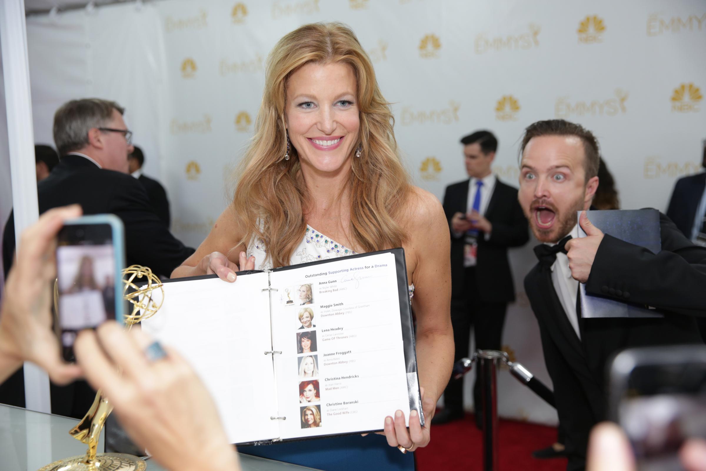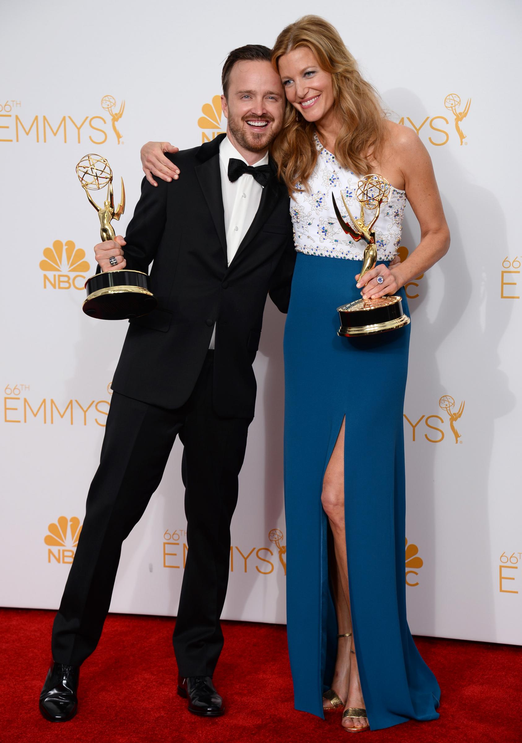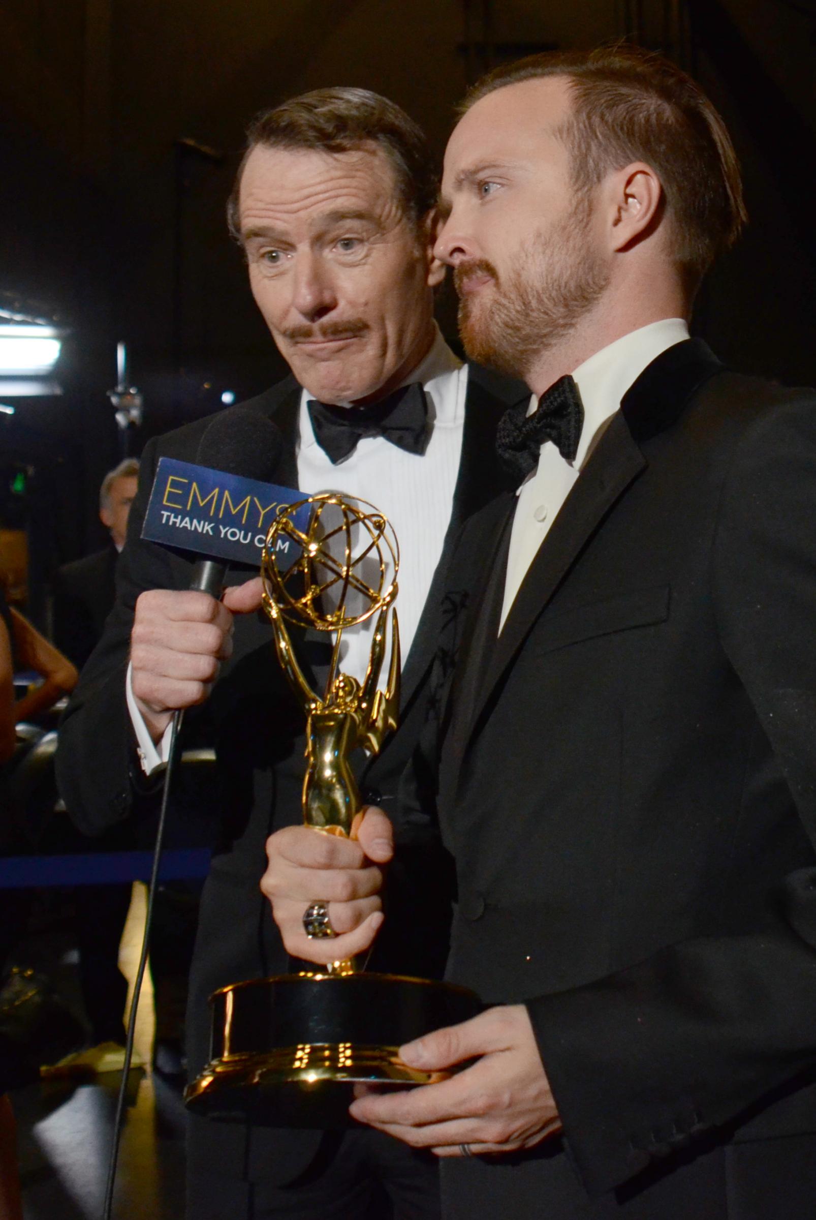 Migliore attore drammatico è stato incoronato infatti Bryan Cranston, alias Walter White, che con un look alla Clark Gable ha ricordato di quando ragazzino amava cercare scorciatoie per sottrarsi alle proprie responsabilità e ha dedicato il premio ai giovani che sono oggi come era lui augurando loro di trovare una passione cui dedicarsi. “Amo recitare e lo farò fino al mio ultimo respiro”. Gloria anche per l’attrice non protagonista femminile di Breaking Bad, Anna Gunn e per Aaron Paul, migliore non protagonista maschile che molto commosso ha ringraziato i colleghi, due in particolare: “Grazie a Vince Gilligan, che ha cambiato la mia vita e ha creduto in me. E grazie Bryan, non c’è giorno che passa che non mi manchi venire sul set e lavorare con te e imparare da te. Mi hai insegnato tanto come attore, ma soprattutto come uomo”.
