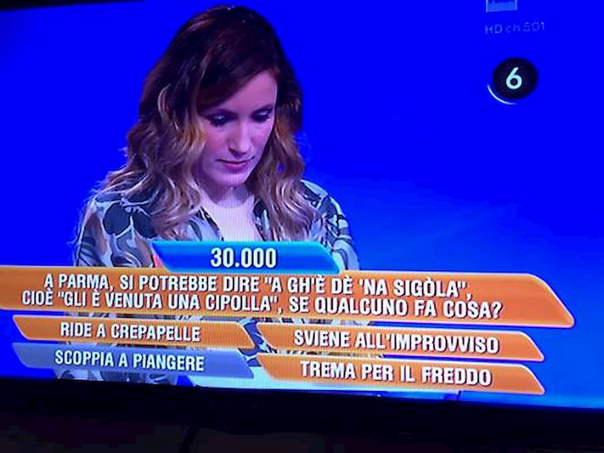La domanda, da 30mila euro, era: che cosa vuol dire “A gh’è dè ‘na sigòla” (gli è data una cipolla, gli è venuta una cipolla). La risposta giusta era: “Sta per svenire”. Il senso dell’espressione in parmigiano è che quando una persona perde i sensi vede tutto girare, vede dei cerchi, proprio come è fatta nel suo interno una cipolla.