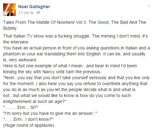 La domanda di cui si lamenta Noel Gallagher, twitta Fazio “non è mai stata fatta. Basta riascoltare… 😉 Ha ragione lui: aveva esagerato la sera prima…”. Il conduttore, insomma, risponde scherzosamente ma non troppo al commento di Noel Gallagher sulla sua pagina Facebook dove riporta un passaggio inesistente dell’intervista tv.