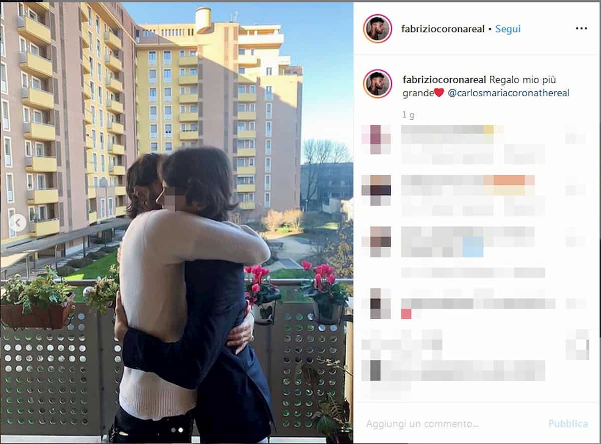 MILANO – Fabrizio Corona abbraccia suo figlio Carlos Maria in una foto postata su Instagram: “Regalo mio più grande” scrive l’ex paparazzo uscito dal carcere per le feste di Natale. Un gesto che commuove anche Nina Moric, mamma di Carlos, che commenta lo scatto con “E non servono le parole …”. Tantissimi i commenti a corredo di questa foto-ricordo, oltre che auguri e raccomandazioni di stare vicino al figlio: “Che dire nel vedere queste foto che trasmettono tante emozioni nell’abbraccio tra un padre e un figlio” scrive qualcuno, e ancora “Questo è il vero amore”, “Padre e figlio, l’immagine più bella che poteva essere mostrata”.