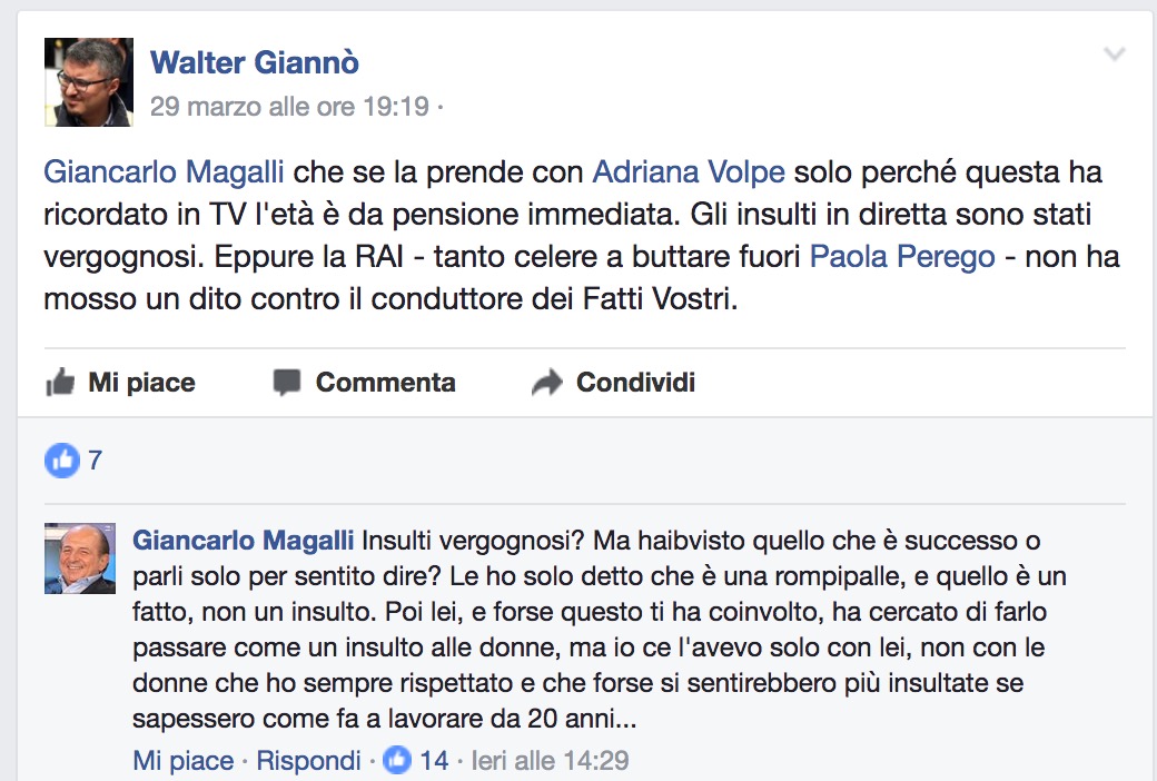 Giancarlo Magalli che se la prende con Adriana Volpe solo perché questa ha ricordato in TV l’età è da pensione immediata. Gli insulti in diretta sono stati vergognosi. Eppure la RAI – tanto celere a buttare fuori Paola Perego – non ha mosso un dito contro il conduttore dei Fatti Vostri.