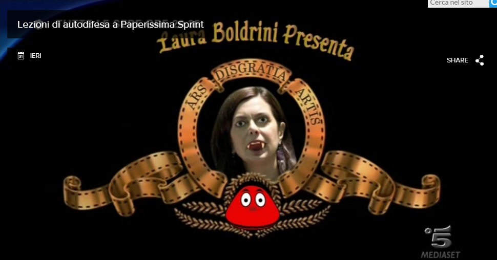 MILANO – Paperissima Sprint lancia le “lezioni di autodifesa” di Maddalena Corvaglia, con il patrocinio del presidente del Senato, Laura Boldrini, da sempre in prima linea nella lotto contro il femminicidio. E nell’immagine di presentazione Boldrini, terza carica dello Stato, appare al posto del famoso leone di Metro Goldwyn Mayer con i denti di un vampiro.