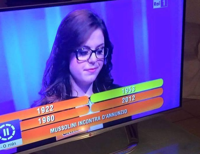 Solo qualche settimana fa un’altra concorrente alla domanda “In Italia, il presidente del Consiglio dei ministri è a capo di cosa?” aveva risposto “la magistratura”. E c’è chi ricorda un’altra gaffe. Sempre una concorrente dell’Eredità è scivolata sugli accoppiamenti temporali tra i nomi e gli episodi della storia. Una domanda chiedeva di accoppiare l’anno all’incontro tra Benito Mussolini e D’Annunzio. Tra le varie opzioni tra cui era possibile scegliere, oltre 1922 che naturalmente è la risposta esatta, c’era il 1953, 1980 e una data ancora più recente. La concorrente Carla risponde, incredibilmente, con “1953”. Uno scivolone che ha imbarazzato il conduttore Fabrizio Frizzi e anche i telespettatori che sui social non hanno risparmiato la concorrente. Questo il video pubblicato dal Corriere della Sera.