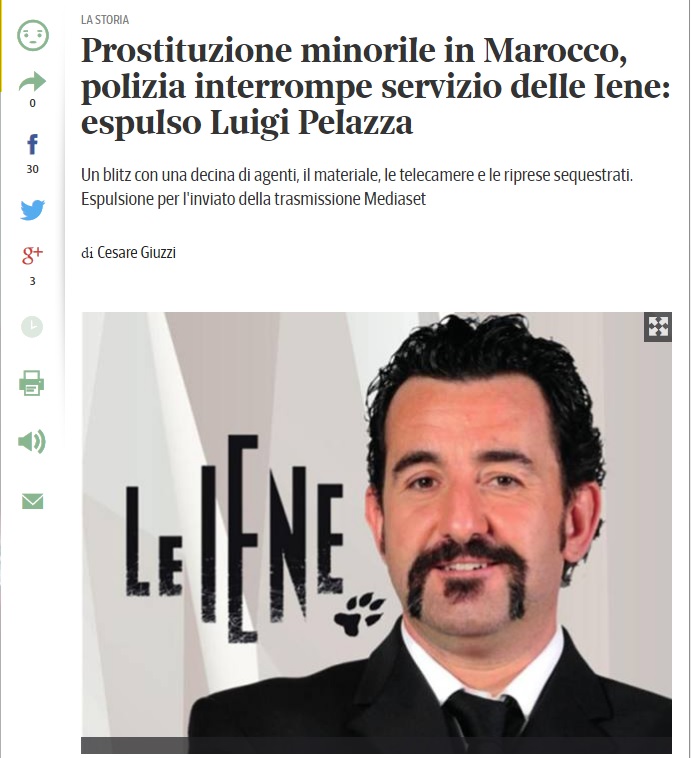 Luigi Pelazza de “Le Iene” è stato espulso dal Marocco. All’inviato del programma Mediaset, che stava girando un’inchiesta sulla prostituzione minorile in Marocco, è stato consegnato un foglio di espulsione al termine di un blitz a Marrakech della polizia marocchina – avvenuto il pomeriggio di ieri, mercoledì 28 settembre – in cui è stato arrestato l’interprete locale e sono stati sequestrati il materiale della troupe, le telecamere e i file con le riprese girate fino a quel momento. Pelazza si trovava a Marrakech da lunedì, e ha raccontato a Cesare Giuzzi del Corriere: