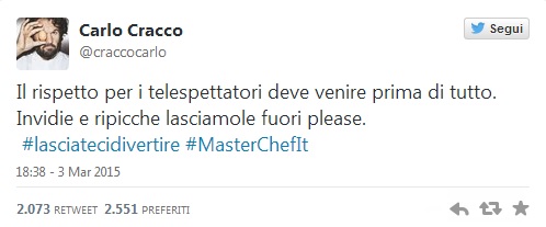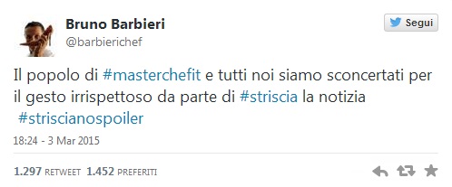 ROMA – Lo scoop di Striscia la Notizia, che ha rivelato il vincitore della quarta edizione di Masterchef Italia 4 (la finale sarà trasmessa giovedì 5 marzo) e accusato uno dei concorrenti, Nicolò Prati di pesanti scorrettezze, ha fatto infuriare Sky. Un dispetto di Canale 5 a Sky Uno, ma sarebbe meglio parlare di colpo di testa di Antonio Ricci, autore di Striscia, che ha preferito andare per la sua strada nonostante, riferiscono voci di corridoio, i ripetuti inviti arrivati dai piani alti di Mediaset di non svelare nulla.