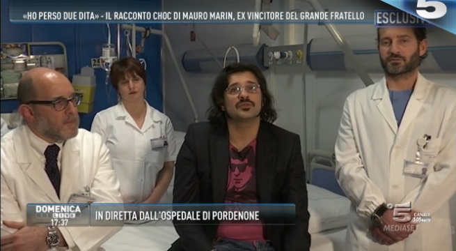 ROMA – A Domenica Live, la trasmissione di Barbara D’Urso, Mauro Marin, il vincitore del Grande Fratello 10, interviene in collegamento dall’ospedale, a pochi giorni dal terribile infortunio in cui ha perso due dita della mano sinistra. E se la prende con il governo: “Voglio ringraziare i miei medici, che sono i veri eroi. A tagliarmi la mano è stato Renzi, con le sue tasse che mi perseguitano e che mi impediscono di lavorare serenamente”.