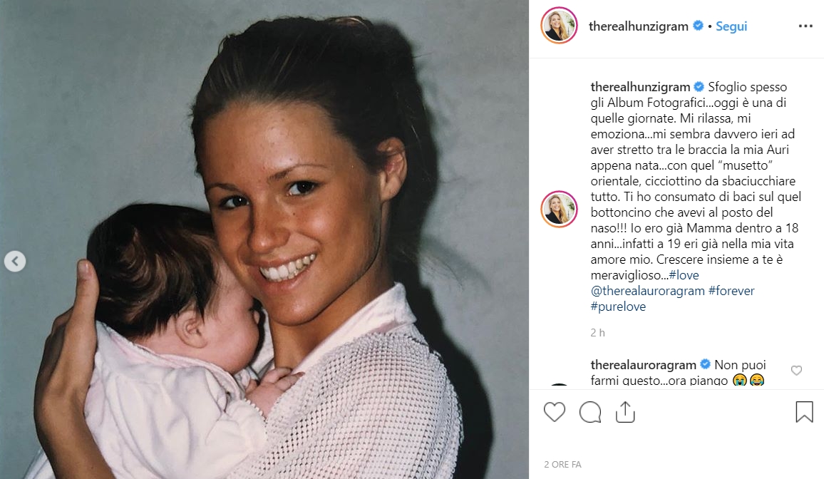 Mamma Hunziker pubblica così una foto con la piccola Aurora, nata il 6 dicembre 1996, e che ora è una ragazza di 22 anni e un personaggio televisivo e la accompagna con questo post: “Sfoglio spesso gli Album Fotografici…oggi è una di quelle giornate. Mi rilassa, mi emoziona…mi sembra davvero ieri ad aver stretto tra le braccia la mia Auri appena nata…con quel “musetto” orientale, cicciottino da sbaciucchiare tutto. Ti ho consumato di baci sul quel bottoncino che avevi al posto del naso!!! Io ero già Mamma dentro a 18 anni…infatti a 19 eri già nella mia vita amore mio. Crescere insieme a te è meraviglioso…”. Una dedica dolcissima a cui la figlia Aurora ha replicato: “Non puoi farmi questo…ora piango”.