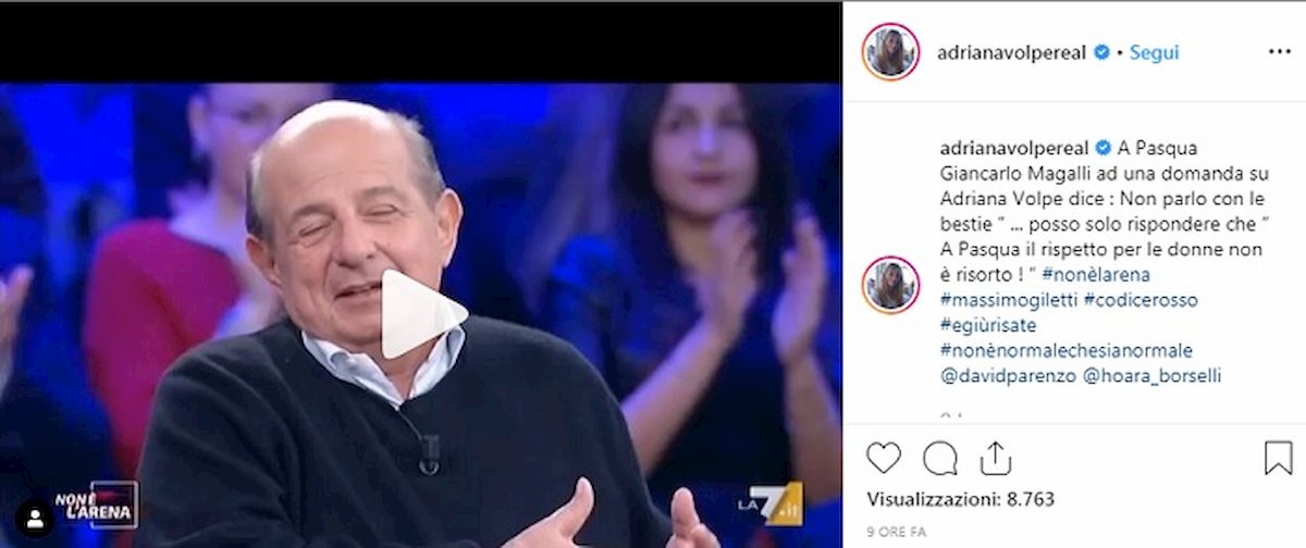 E Adriana Volpe non l’ha affatto presa bene. Dopo aver condiviso lo spezzone della trasmissione sul suo profilo Instagram, la Volpe ha scritto: “A Pasqua Giancarlo Magalli ad una domanda su Adriana Volpe dice: ‘Non parlo con le bestie’ … posso solo rispondere che ‘A Pasqua il rispetto per le donne non è risorto!'”. Ed è subito pioggia di commenti indignati. Tra le risposte spicca quella della collega Monica Setta: “Non mi piace neanche l’atteggiamento di tutti gli altri in trasmissione. Inaccettabile”.