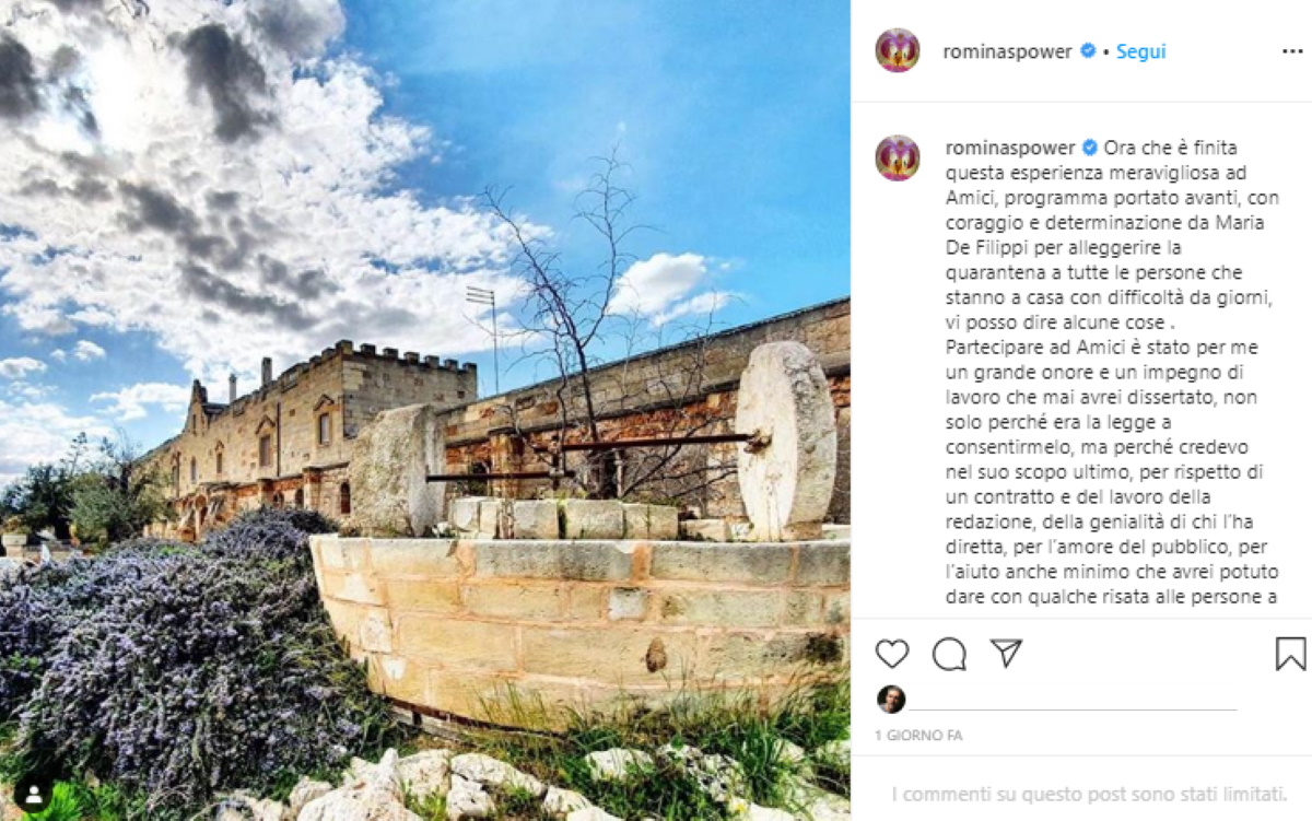 ROMA – Romina Power passerà la quarantena da coronavirus nella tenuta di famiglia di Cellino San Marco dell’ex marito Al Bano. Questo l’annuncio della cantante su Instagram al termine dell’impegno con il talent show di Amici di Maria De Filippi. Una quarantena “affollata” dato che nella stessa tenuta dovrebbero vivere anche Loredana Lecciso con i figli Jasmine e Albano Junior.