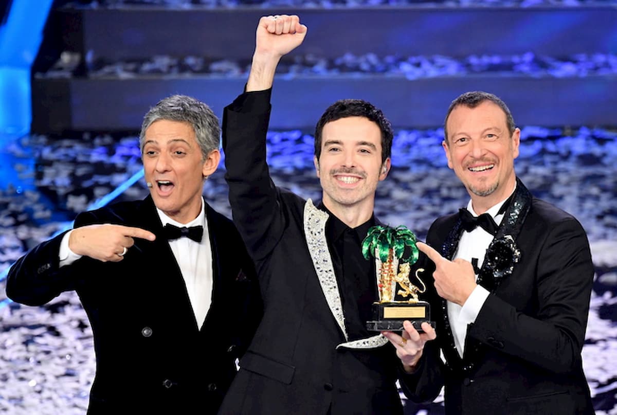 Sanremo 2020, il vincitore Diodato con Amadeus e Fiorello (Ansa)