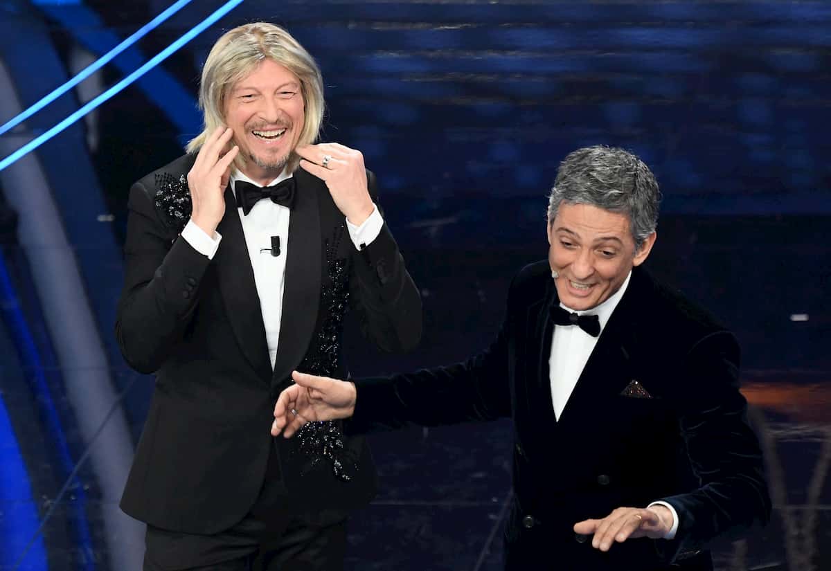 Sanremo 2020, il Festival dei record: finale mai così bene dal 2002. Ora Amadeus bis? (nella foto Ansa, Fiorello con Amadeus vestito da Maria De Filippi durante la finale di Sanremo)