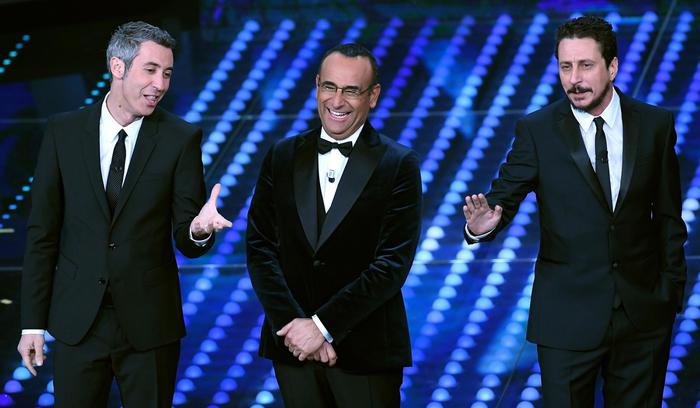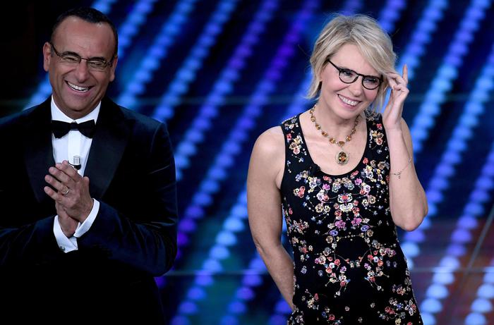 Se Maria De Filippi osa di più nel look, prima con le mini applicazioni colorate e poi con il gioco delle trasparenze, e lancia il bacio in platea, Carlo Conti ironizza sulla caramella, gioca con le ‘figlie d’arte’ Anouchka Delon e Annabelle Belmondo, ma entrambi lasciano più spazio alle canzoni.