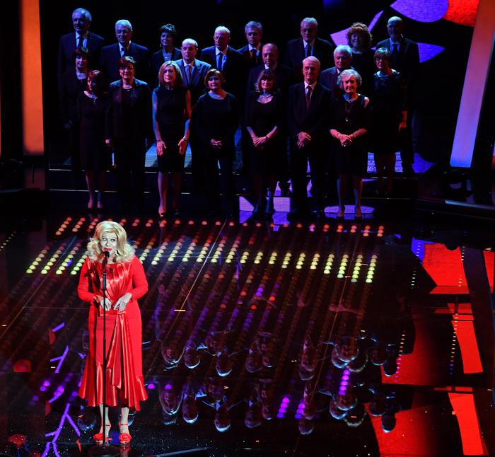 Girotondo finale con Conti e Maria De Filippi, sulle note della marcetta di Otto e mezzo di Fellini.