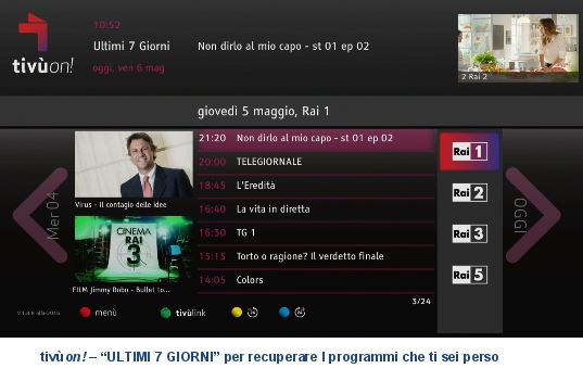 ROMA – Ti sei perso l’ultima puntata del tuo programma preferito e non sai come fare per rivederlo? Non disperare. Grazie a tivùon!, nuovo servizio lanciato da Tivù srl, società che gestisce la piattaforma satellitare tivùsat, hai la possibilità di accedere ai contenuti “On Demand” televisivi con grande facilità. Quanto costa? Assolutamente nulla. Tivùon! è offerto gratuitamente a tutti gli utenti che hanno tv e decoder con bollino tivùon e una connessione a banda larga alla rete Internet. Si tratta del primo “On Demand” gratuito della televisione in chiaro in Italia. Un altro aspetto vantaggioso di quella piccola rivoluzione chiamata Internet Tv.