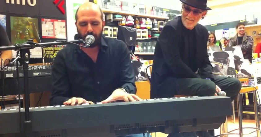 L’attore pugliese e il famoso pianista (attualmente impegnato in uno spettacolo tutto suo su Rai Uno) erano a casa di amici e hanno eseguito a quattro mani Azzurro, il brano portato al successo da Adriano Celentano (video Repubblica Tv).