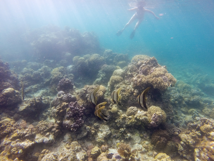 Abbiamo seguito gli squali del reef intorno alla barriera corallina, visto pesci pagliaccio nuotare intorno agli anemoni, pesci bandiera scivolare dolcemente verso le acque profonde, pesci pappagallo fluorescenti e raggi di sole che filtravano dalla superficie. Ovunque nuotavamo, l’oceano era vivo.