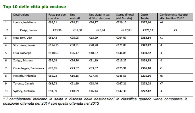 Londra, dallo scorso anno, sale di sei posizioni nella graduatoria delle città piu’ care prendendo il posto di Oslo, prima classificata l’anno scorso. A seguire, Stoccolma e Oslo (che aveva primeggiato nel 2013).