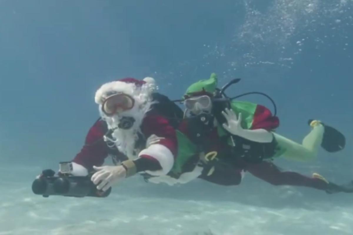 PALM BEACH (FLORIDA) – Nel Palm Beach Gardens shopping center di Miami, un improvvisato Babbo Natale rimane incastrato con la parrucca e la barba nella fune che sta utilizzando per calarsi.