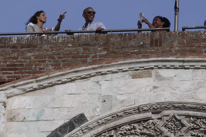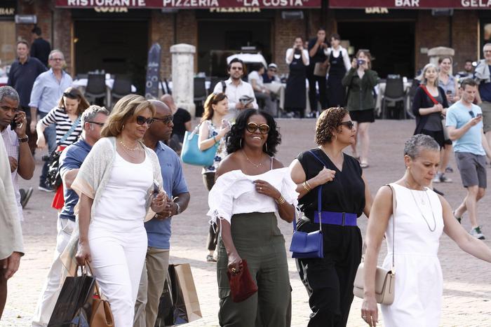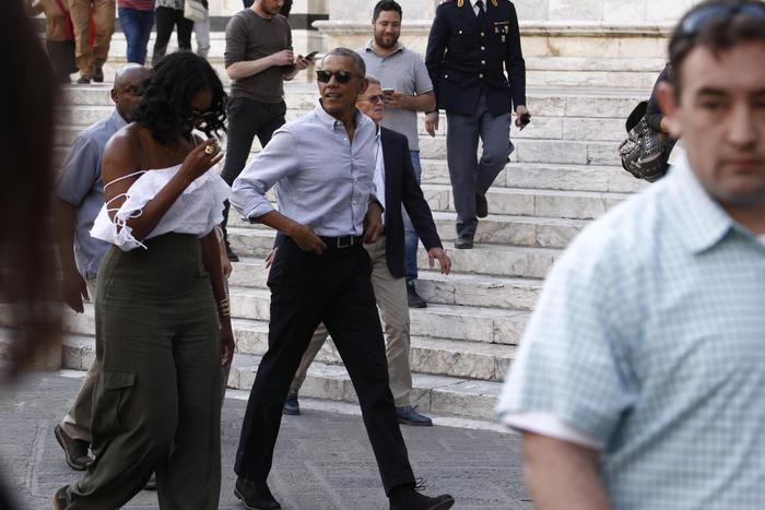 SIENA – Pomeriggio a siena per l’ex presidente Usa Barack Obama e la moglie Michelle: insieme, dopo che lei aveva fatto shopping nel centro della città, hanno visitato Palazzo Pubblico, dove erano stati invitati dal sindaco Bruno Valentini, per vedere il restauro della Maestà di Simone Martini. Poi nel Duomo di Siena dove gli ex inquilini della Casa Bianca si sono fatti fotografare con alcuni turisti americani e dove, prima di uscire, hanno acceso una candela davanti all’immagine della Madonna del Voto.
