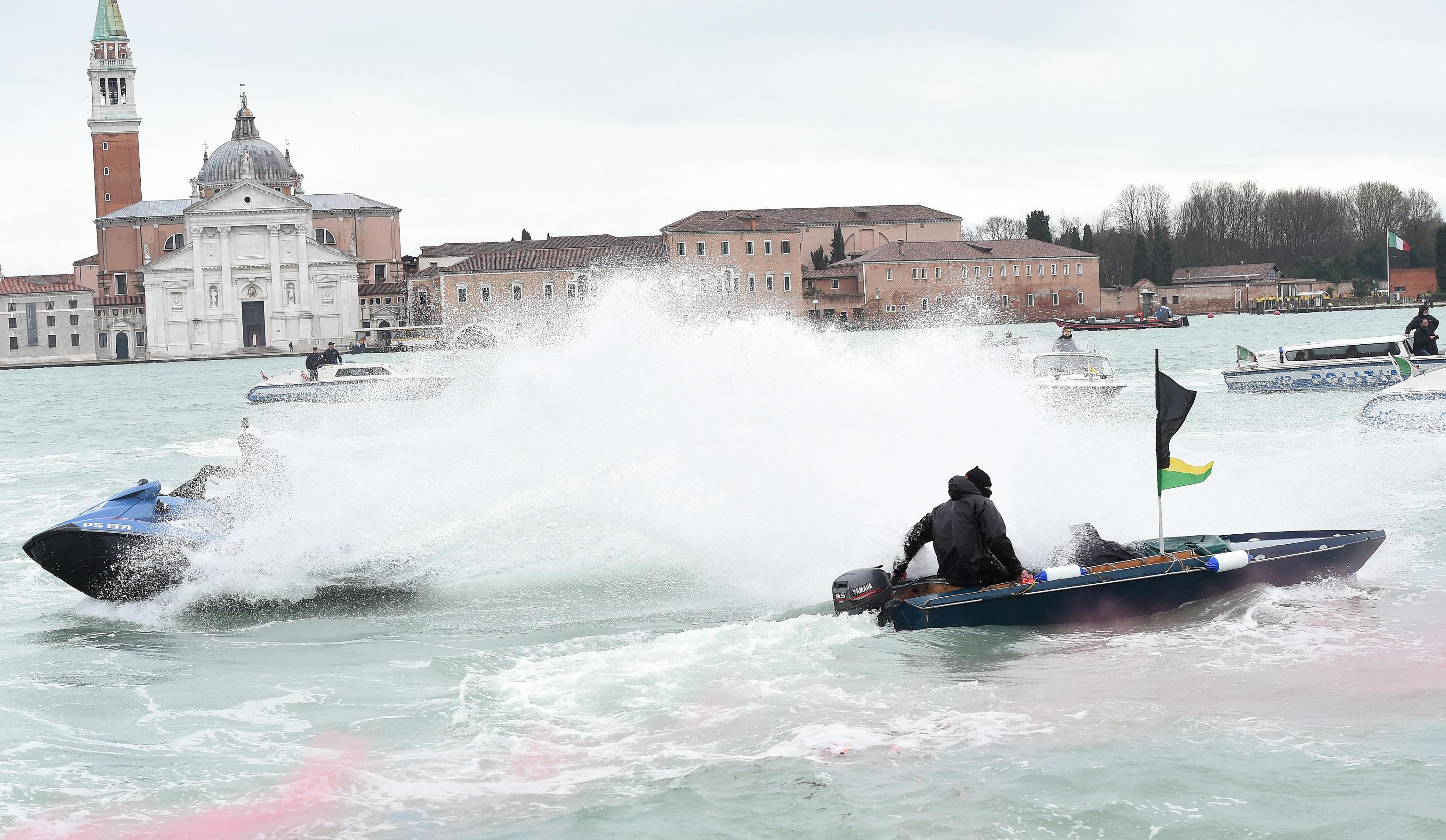 Le forze dell’ordine, in tenuta antisommossa, e gli agenti della polizia municipale, entrambi in presidio sull’acqua con le barche di servizio, hanno controllato che fosse seguito il percorso stabilito (foto Ansa).