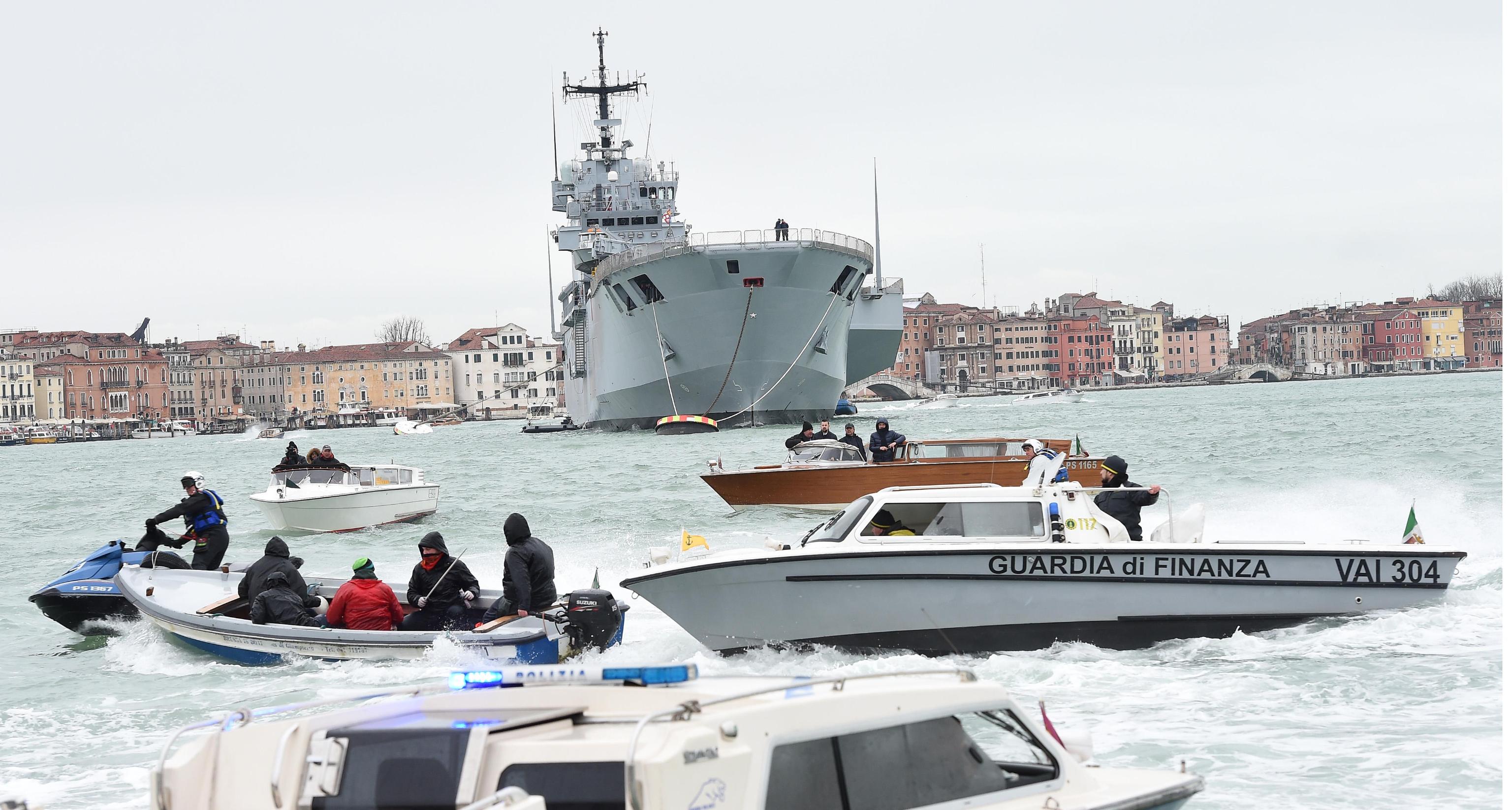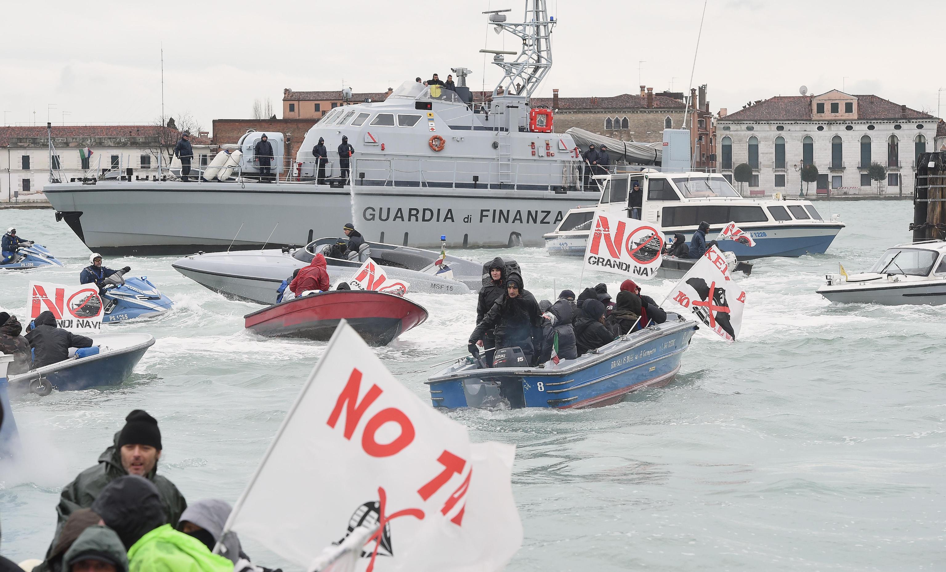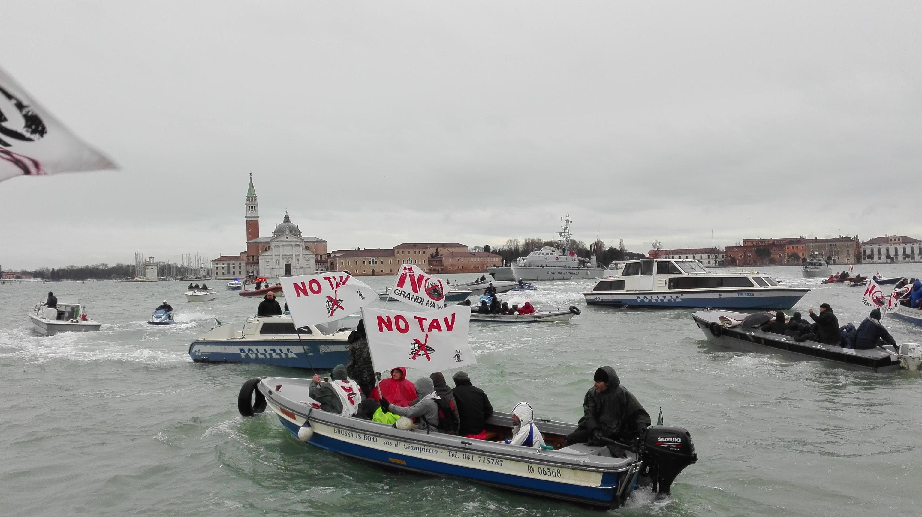 “Fuori le navi dalla Laguna” è lo slogan ripetuto come un mantra dai manifestanti dei No Tav e No grandi navi lungo il percorso per Venezia, sotto una pioggerellina costante. Metà dei manifestanti, dopo il raduno, davanti alla stazione, sono saliti su numerosi barchini che li attendevano, attraccati, sulla rive del canal grande. Il percorso, sia lungo i rii che le calle veneziane, è proseguito secondo un itinerario “obbligato”. Ed è qui che molti hanno tentato lo sfondamento.