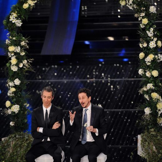 SANREMO – Vestiti da sposi, sotto un arco di fiori d’arancio, Luca Bizzarri e Paolo Kessisoglu a fine serata rientrano sul palco dell’Ariston e dedicano il loro secondo sketch alle nozze gay. Ma il tema è anche un felice terreno di equivoci per far satira sui luoghi comuni del rapporto a due.
