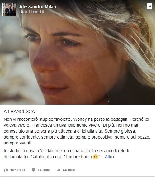 Si è trattato di tre minuti di commozione pura: Francesca Del Rosso Wondy è morta l’11 dicembre scorso dopo una lunga lotta contro il cancro che la gioranlista e scrittrice 42enne non ha mai voluto nascondere. “Hai perso la battaglia dunque, ma hai lasciato tanto. – scrive nella lettere il giornalista del Sole 24 Ore – .A Me, due splendidi bambini, al mondo… (clicca qui per leggere la lettera integrale, clicca qui invece per il blog di Francesca).