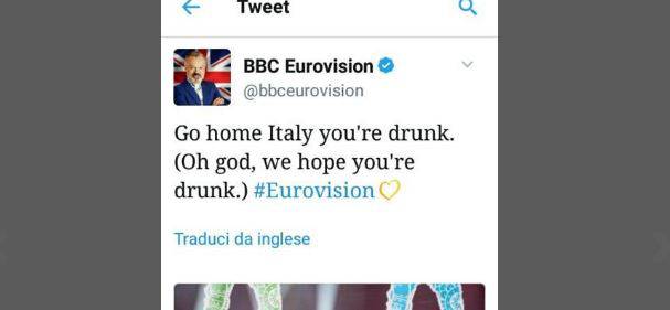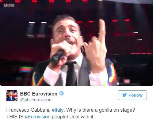 Tutto ha avuto inizio con il seguente tweet: “Italia vai a casa sei ubriaco. (Mio Dio, speriamo tu sia ubriaco)”. Immediate le polemiche da parte degli italiani, che hanno indotto la tv di Stato britannica a rimuovere il post imbarazzante. Ma non è finita lì perché poco dopo ne è comparso un altro, stavolta riferito alla scimmia che accompagna da sempre l’esibizione di Occidentali’s Karma. “Perché c’è un gorilla sul palco? Questo è l’Eurovision, gente”.
