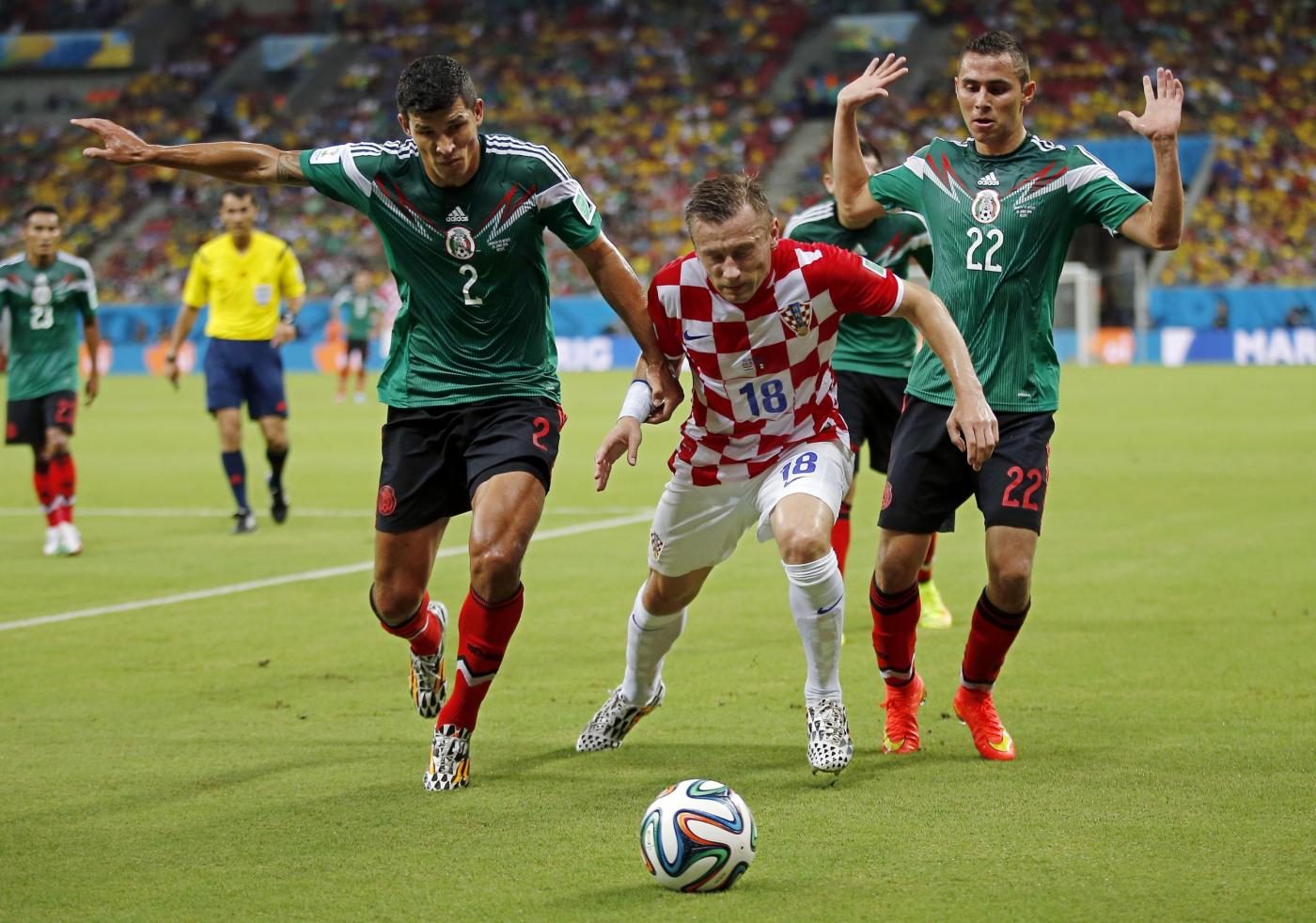 Messico (5-3-2): Ochoa 7, Aguilar 6.5, Rodriguez 6 Marquez 7, Moreno 6.5, Layun 6, H. Herrera 6.5, Vazquez 6, Guardado 7 (40′ st Fabian sv), Dos Santos 5 (17′ st Hernandez 7.5), Peralta 6.5 (34′ st Pena sv). (1 Corona, 12 Talavera, 3 Salcido, 5 Reyes, 8 Fabian, 9 Jimenez, 11 Pulido, 16 Ponce, 17 Brizuela, 20 Aquino). All.: M. Herrera 7.5. Arbitro: Irmatov (Uzbekistan) 4.5. Reti: nel st 27′ Marquez, 31′ Guardado, 37′ Hernandez, 42′ Perisic Angoli: 9 a 7 per il Messico. Espulso: nel st 44′ Rebic per gioco falloso. Ammoniti: Rakitic, Marquez e Vazquez per gioco falloso. Recupero: 2′ e 4′. Note: spettatori 37.000 mila circa.
