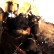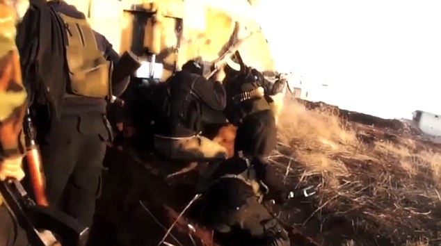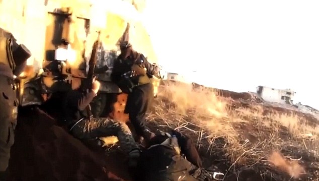 La telecamera è in azione accanto a numerosi fucili mitragliatori puntati contro le truppe governative di Assad da dietro un veicolo corazzato. I miliziani sembrano avanzare contro gli uomini di Assad, in mezzo ai quali probabilmente ci sono assistenti russi militari russi, al riparo del mezzo blindato.