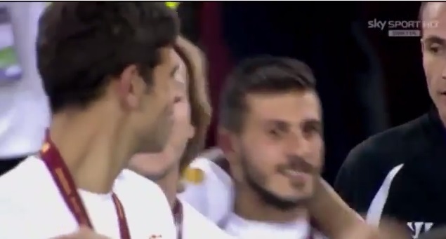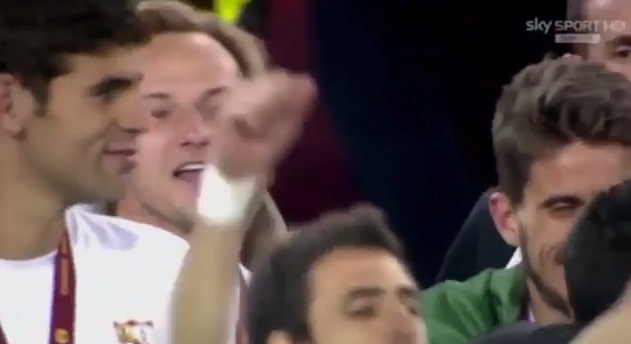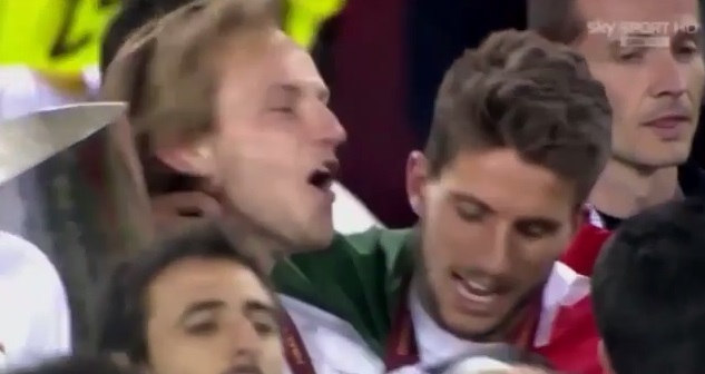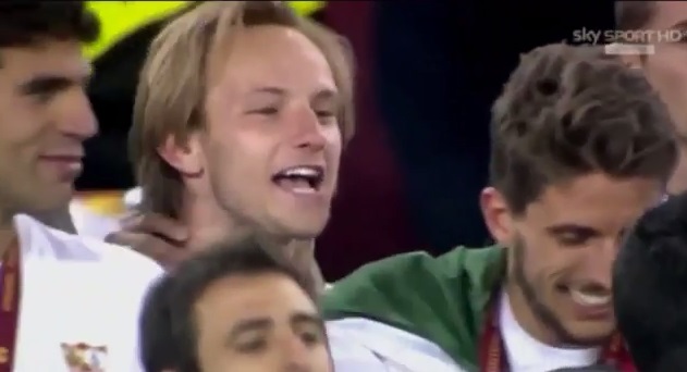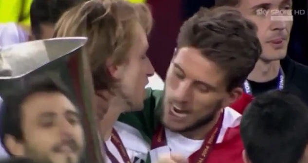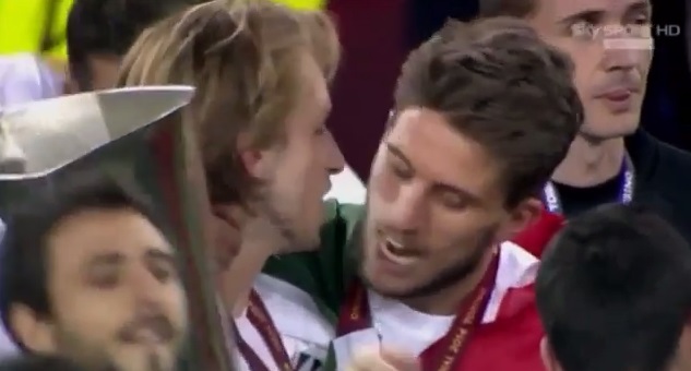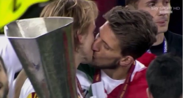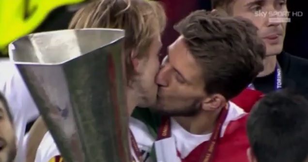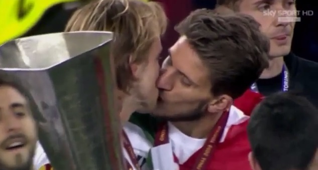 ROMA – Un bacio sulla bocca per festeggiare l’Europa League. E’ il bacio tra il croato Ivan Rakitic, capitano del Siviglia, e il difensore portoghese Carrico durante il giro d’onore dopo la vittoria ai rigori conto il Benfica (frastornato dalla ennesima sconfitta in finale, come la maledizione di Bela Guttmann insegna) allo Juventus Stadium.
