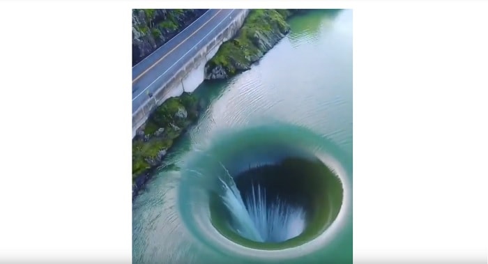 Questo enorme buco, visto dall’alto, risulta ancora più impressionante. Il lago, come spiega Il Gazzettino, è artificiale. Il luogo è diventato famoso proprio per un’opera di ingegneria. In questa valle, una volta c’era un paese, Monticello, ora interamente sommerso per far spazio a una diga.