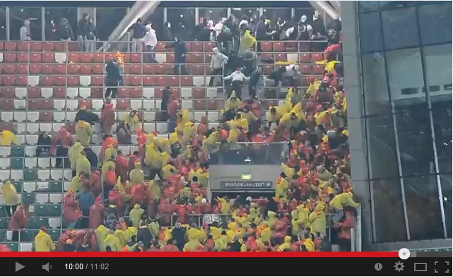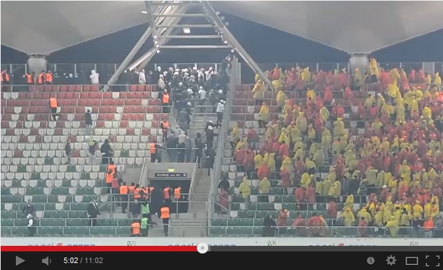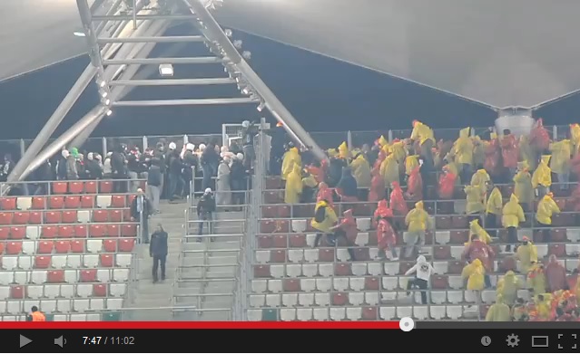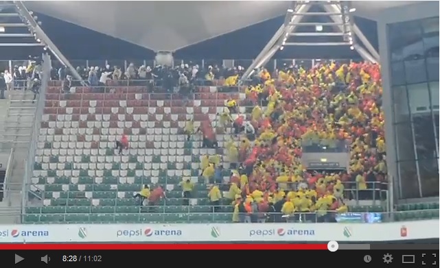 Il video che vi mostriamo dura 11 minuti e tanto – un’eternità – sono durati gli scontri allo stadio fra le due fazioni. Nulla hanno potuto gli steward, che non sono riusciti ad arginare la valanga degli ultras del Legia. Sono rimasti ad affrontarsi solo i due gruppi ultras, separati dalla barriera divisoria in metallo che non ha retto alle pressioni che venivano dall’una e dall’altra parte.