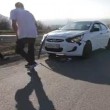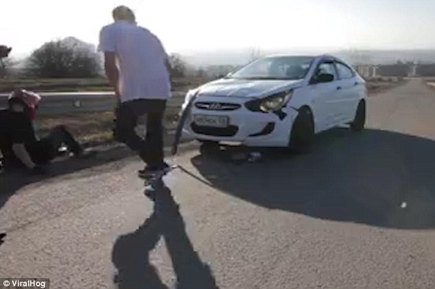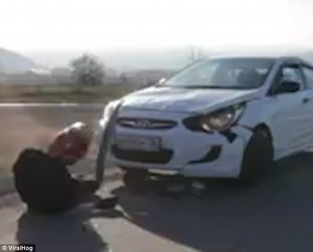 Il temerario indossa un casco, ma non l’abbigliamento protettivo. L’amico che riprende il tutto si trova dietro a lui a poca distanza e non rimane coinvolto nell’impatto. il giovane, dopo essere stato colpito dall’auto sembra rialzarsi quasi subito dato che, incredibilmente ha riportato solo delle escoriazioni e delle ferite lievi.