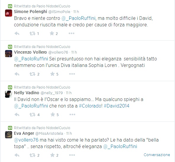A bacchettare Ruffini non solo la Loren, che con eleganza richiama il conduttore per quel “topa meravigliosa”, ma anche gli utenti del web, tra chi boccia la conduzione di Ruffini ai David e chi invece lo accusa di presunzione. Non è mancato poi chi, tra gli utenti di Twitter, si è chiesto a chi andasse il premio “Miglior figura di merda…”.