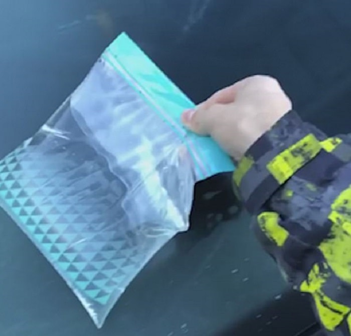 Daniel Harris è la persona che ha condiviso su Facebook un video che mostra il suo metodo che consiste nel riempire una busta per alimenti con dell’acqua calda che viene poi fatta passare sul parabrezza ghiacciato. In pochi secondi il ghiaccio si scioglierà ottenendo così un risultato facile ed immediato.