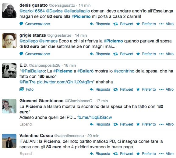 La Picierno ha voluto tornare sull’argomento e durante la diretta di Ballarò ha ribadito il concetto tirando fuori uno scontrino del supermercato che il conduttore Giovanni Floris ha letto voce per voce in diretta: “Fare la spesa per due settimane, con 80 euro, è possibile”.