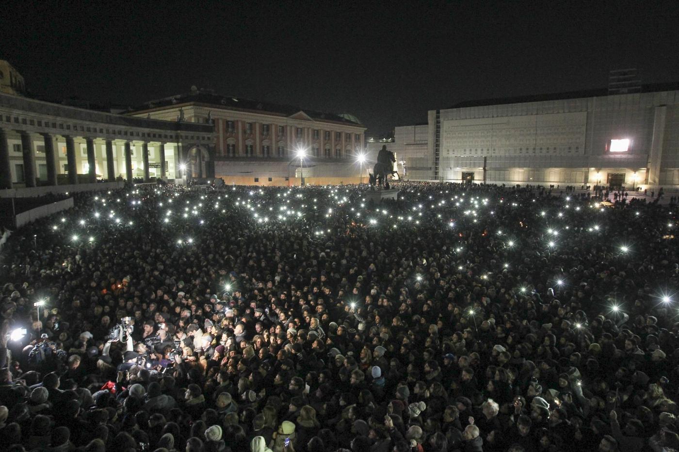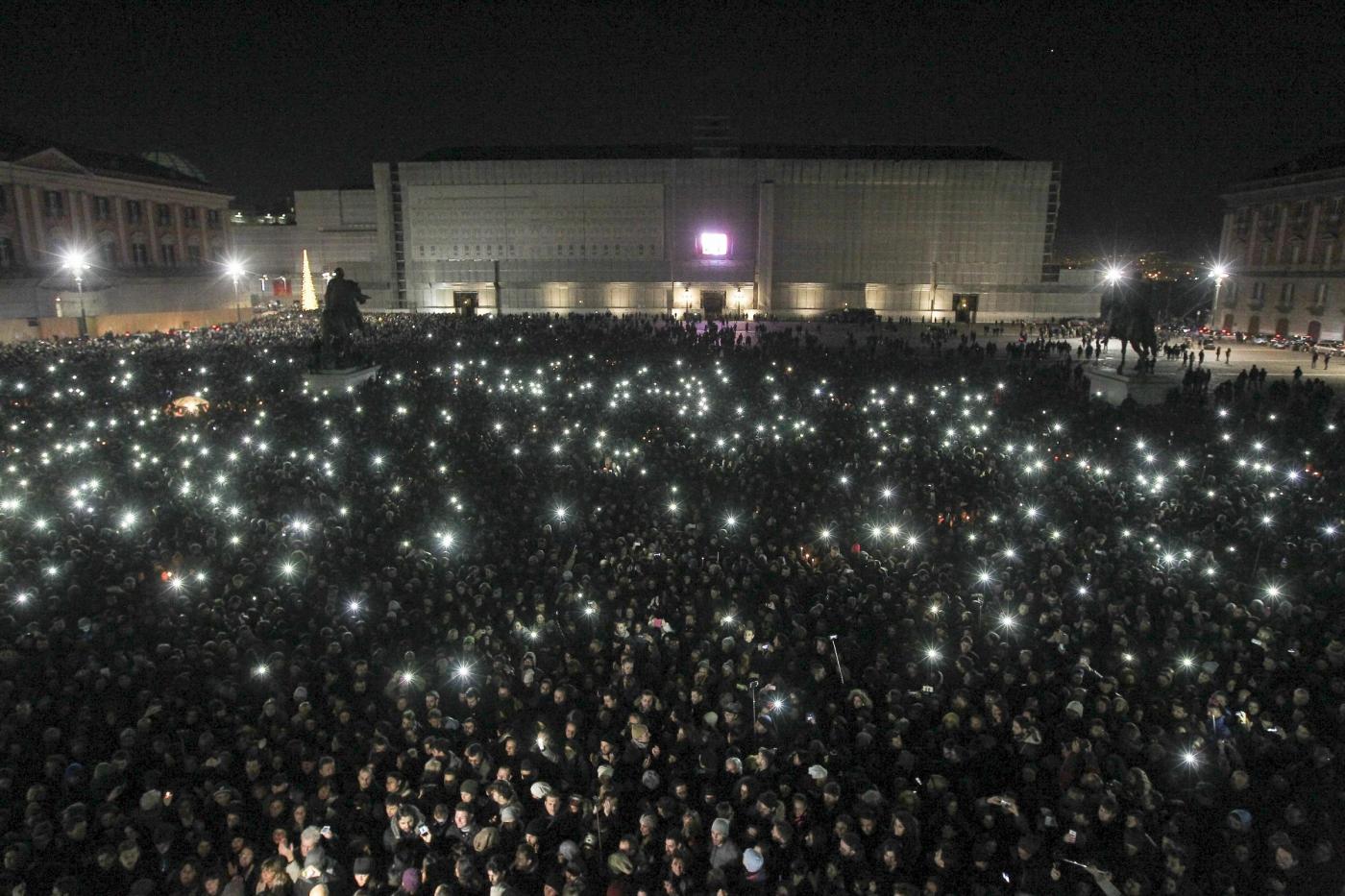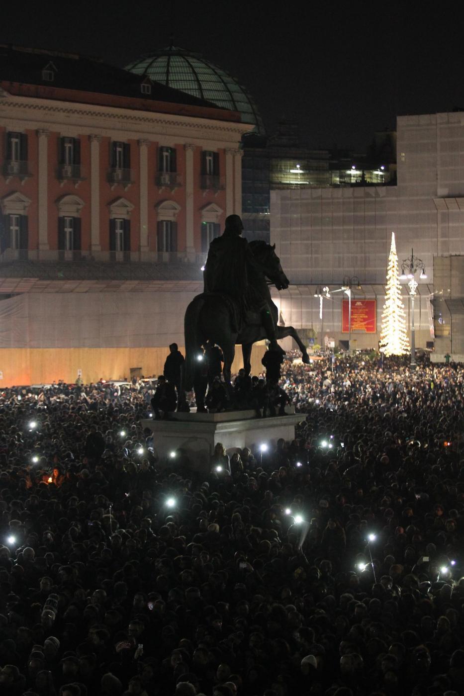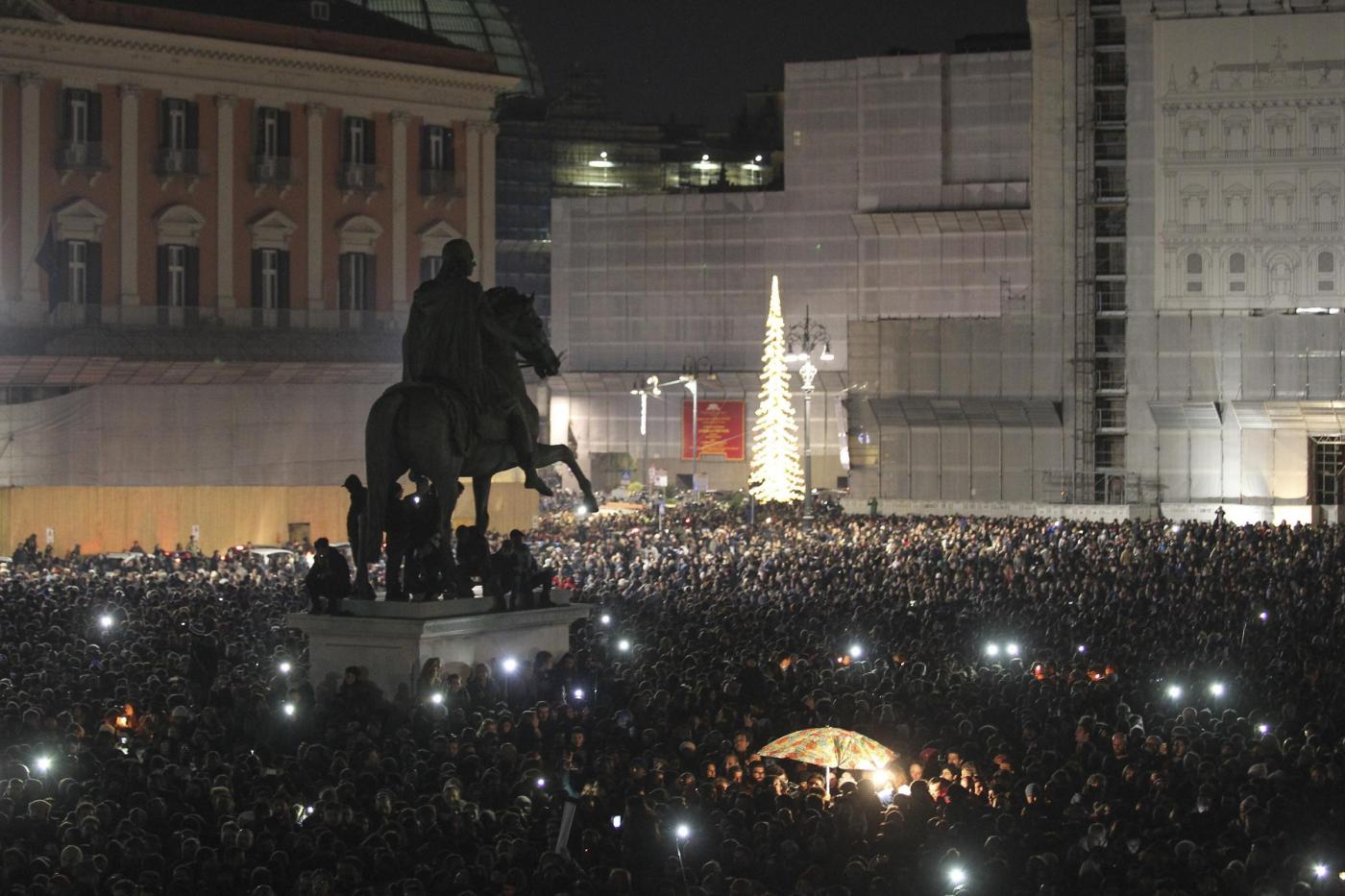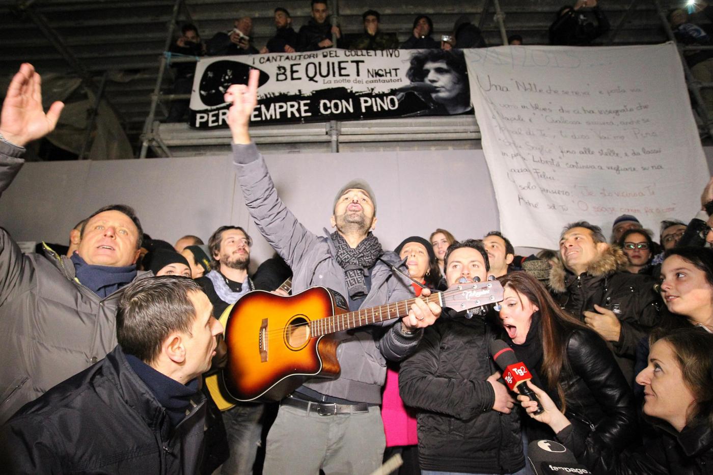 NAPOLI – Centomila napoletani in piazza Plebiscito cantano Napule è, Je so pazzo, Nero a metà. Soprattutto la prima canzone sta diventando la colonna sonora di un cantante che ha fatto della propria napoletanità un marchio di fabbrica. Un rapporto di amore e odio, tra Pino Daniele e Napoli, ma non si può non identificare il cantante con alcuni aspetti perculiari dell’essere napoletani. Comunque sia, Napoli ha scelto queste canzoni per rendere omaggio al cantante morto di infarto la notte del 5 gennaio. Il flash mob è stato organizzato appena si è saputo che il secondo funerale del cantante si sarebbe celebrato a Napoli, lo stesso giorno delle esequie celebrate a Roma. I funerali napoletani sono fissati alle 19 del 7 gennaio nella Chiesa di San Francesco di Paola.