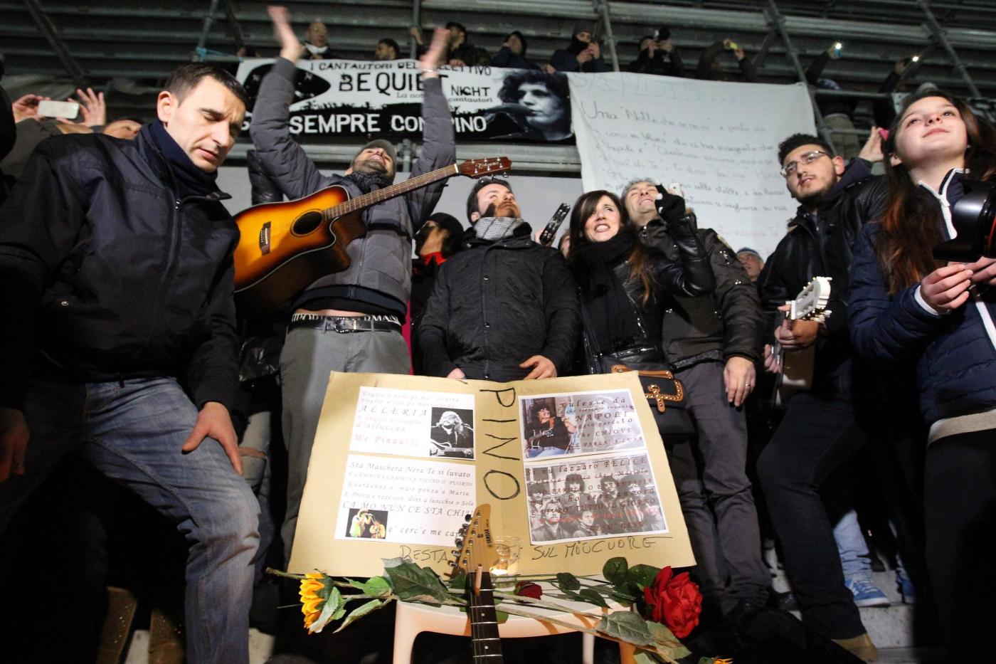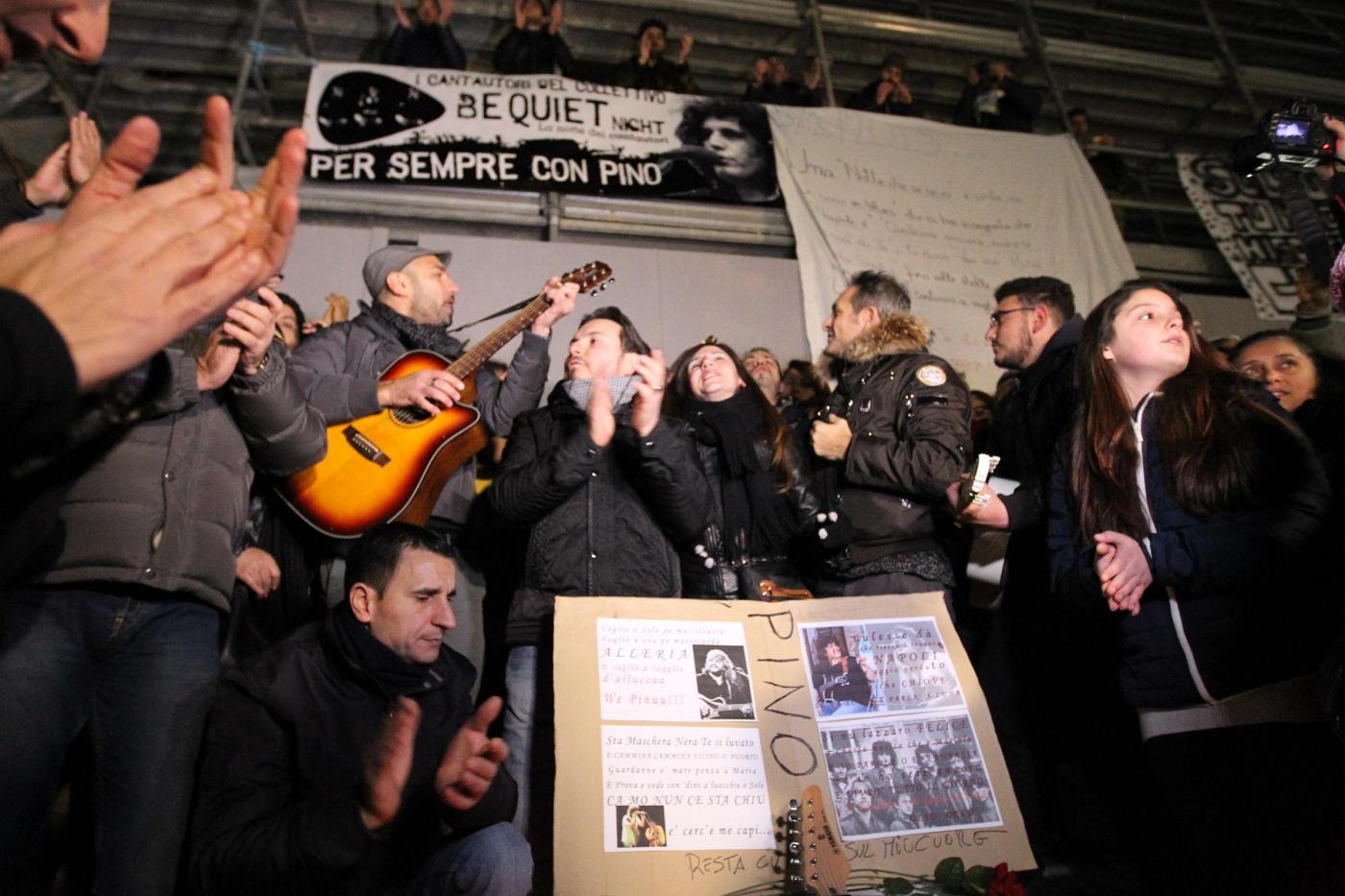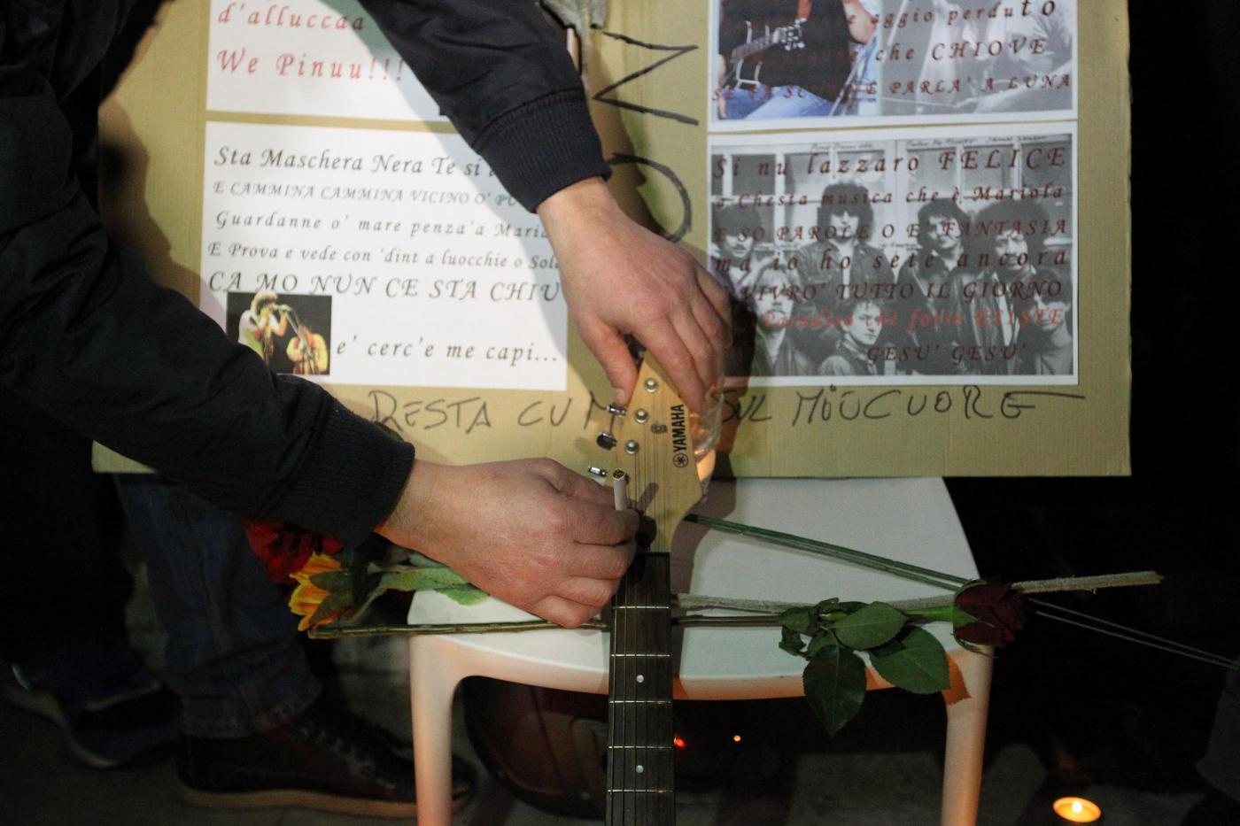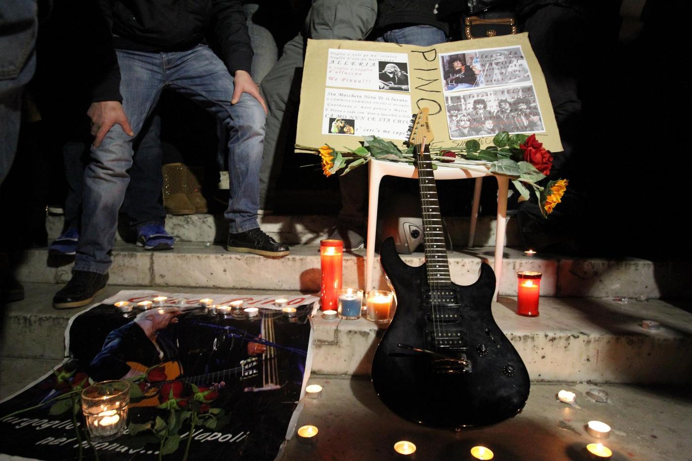 E’ stata una festa che ha riempito una piazza buia, illuminata dai cellulari accesi e dalle candele, luci che si muovono al ritmo delle sue canzoni. Lì la città rende omaggio a Pino Daniele, con i fan che hanno portato una delle chitarre dell’artista e sue fotografie. In fondo, davanti alla chiesa, dove si sono raccolte migliaia di persone, sono stati affissi, sulle impalcature dei lavori, striscioni: ”Solo tu per sempre”, ”Dopo te nisciuno più”, e ”Ciao guagliò”. Nonostante l’appuntamento fosse per le 20.45, già da molto prima le persone hanno iniziato a riempire la piazza, per stringersi intorno al cantautore mai dimenticato della città. Il sindaco annuncia anche l’intenzione di intitolare all’artista una strada o una piazza di Napoli. ”E’ il minimo”, fa sapere e ricorda che era desiderio di Pino Daniele ”provvedere ai giovani musicisti napoletani”.