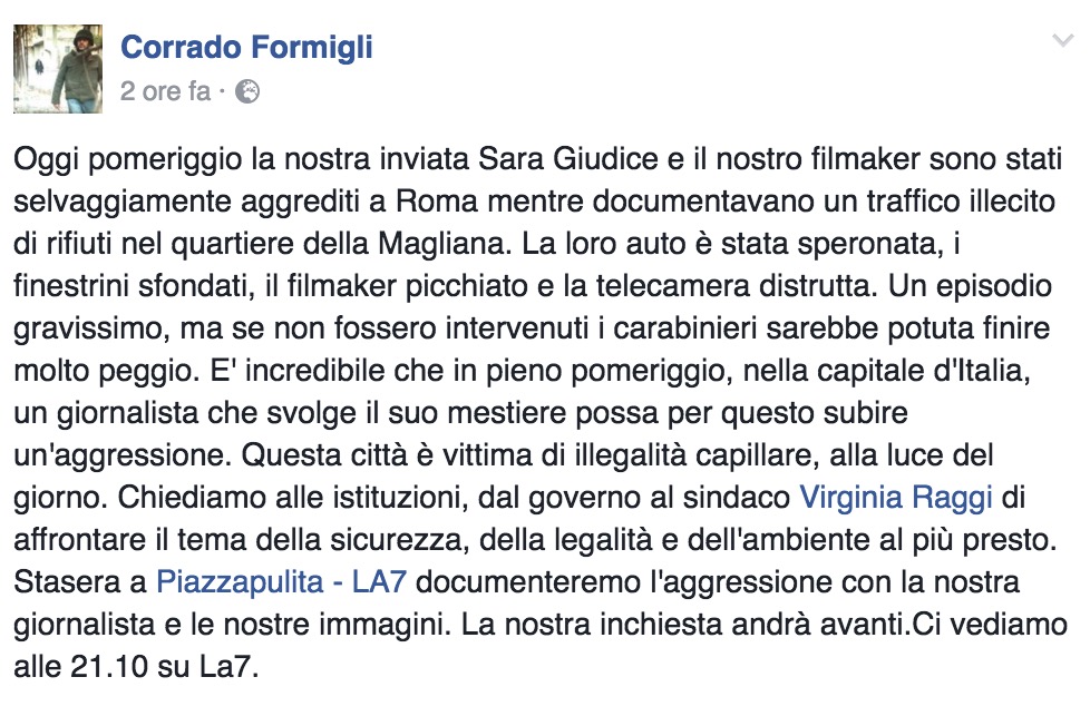 ROMA – ”Oggi pomeriggio la nostra inviata Sara Giudice e il nostro filmaker sono stati selvaggiamente aggrediti a Roma mentre documentavano un traffico illecito di rifiuti nel quartiere della Magliana”: lo scrive su Facebook Corrado Formigli, conduttore del programma di La7 Piazzapulita.