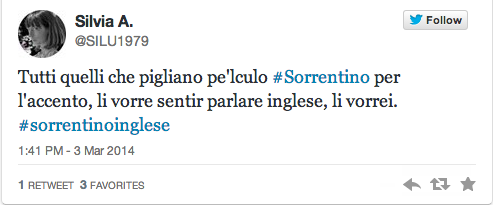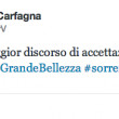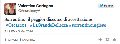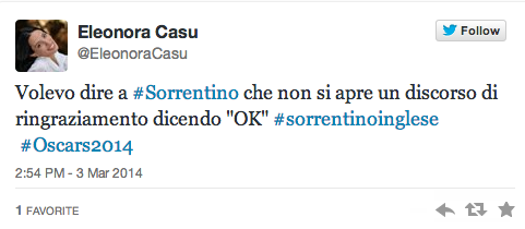 Dopo il controverso omaggio all’evasore fiscale Diego Armando Maradona, il web punta il dito contro la pronuncia non proprio british del regista – tanto da meritarsi un hashtag #sorrentinoinglese, traino di una lunga sfilza di commenti acidi – che sul palco degli Academy Awards aveva fatto un breve elenco di ringraziamenti (oltre ai parenti, agli attori, ai produttori e alla crew de La Grande Bellezza, c’erano i Talking Heads, Martin Scorsese e Federico Fellini).
