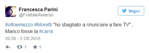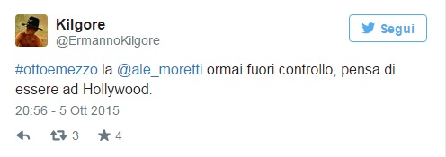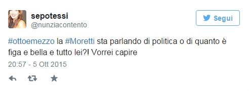 C’è chi si domanda: “La #Moretti sta parlando di politica o di quanto è figa e bella e tutto lei?! Vorrei capire”, e chi scrive: “La Moretti ormai fuori controllo, pensa di essere ad Hollywood”. E ancora: “#Moretti “ho sbagliato a rinunciare a fare TV”… Manco fosse la Carrà”, e “La Moretti ha appena detto di essere di sinistrAHAHAHAHAHAHAHAHAHAHA”.
