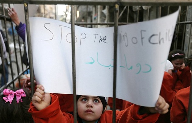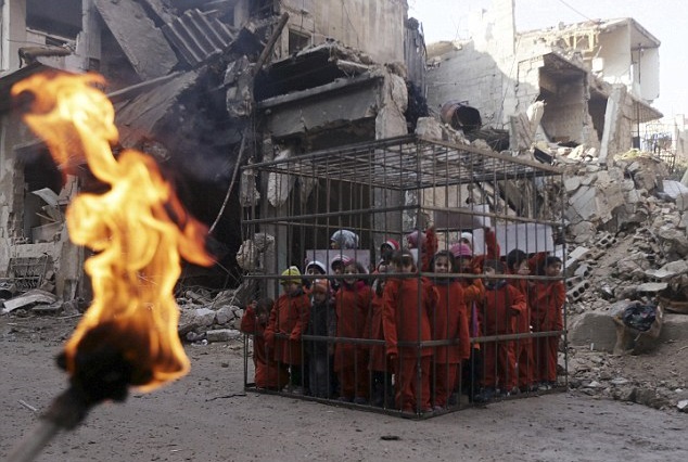 Accanto ai piccoli oramai entrati tutti in gabbia (alcuni hanno solo tre anni) si avvicina poi un uomo con una torcia ardente, la stessa utilizzata per bruciare la gabbia di Moaz al-Kasasbeh. Per fortuna, essendo solo una trovata messa in atto da alcuni attivisti che chiedono che le presunte atrocità del presidente siriano Bashar al-Assad vengano paragonate a quelle inflitte dai jihadisti, i bambini all’interno della gabbia non vengono toccati. A questo punto, alcuni dei piccoli nella gabbia tirano fuori degli striscioni in cui c’è scritto: “Fermare l’uccisione dei bambini’.