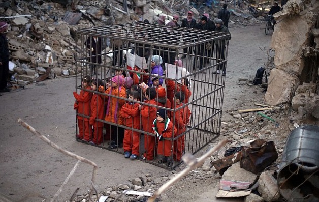 DAMASCO – Con una tuta arancione simile a quella indossata dal pilota giordano ucciso dall’Isis, un gruppo di giovanissimi entra in una gabbia per mettere in scena una protesta contro le uccisioni dei bambini che avvengono in Siria, per mano non solo dell’Isis ma anche di Bashar al-Assad. La singolare protesta è stata organizzata per denunciare le violenze perpetuate dal regime siriano sui bambini.