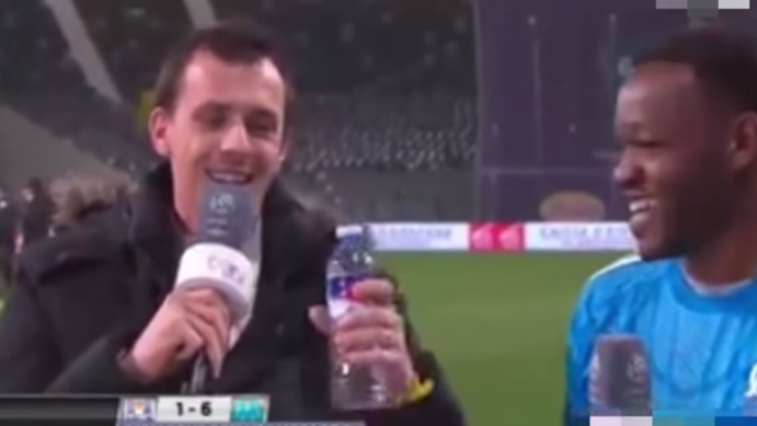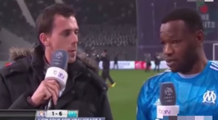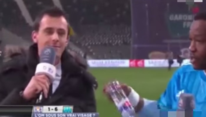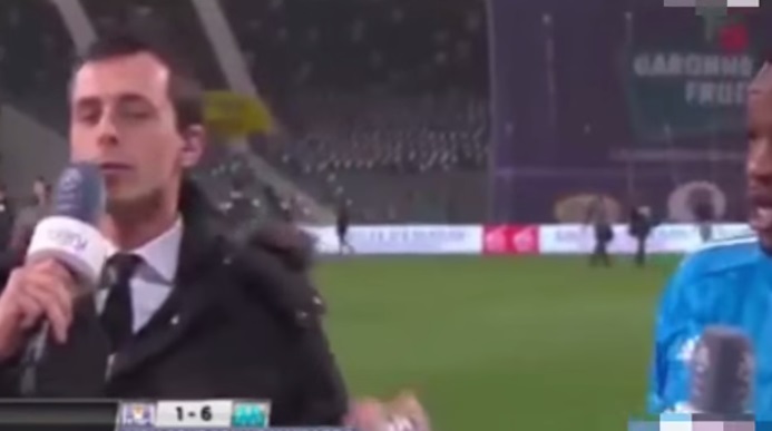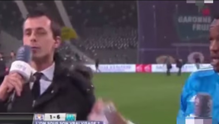 MARSIGLIA – Steva Mandanda, il portiere del Marsiglia, intervistato a bordo campo alla fine della partita, salva il giornalista da una bottiglietta d’acqua lanciata dagli spalti e la afferra con disinvoltura. A Tolosa il Marsiglia del loco Bielsa ha vinto 6-1.
