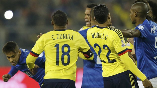 Dopo la sconfitta dell’esordio contro il Venezuela, la Colombia batte il Brasile e lo aggancia in vetta alla classifica del girone C. Nel finale espulsi Neymar e Bacca.