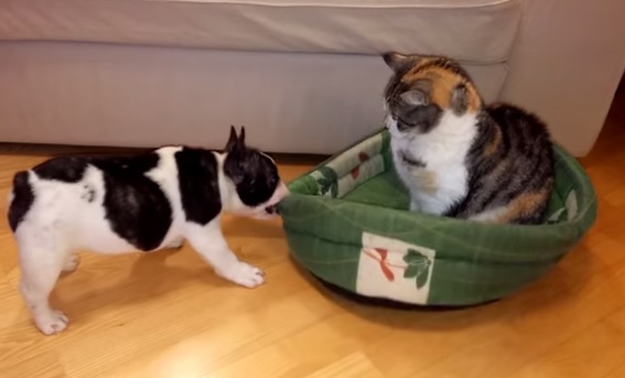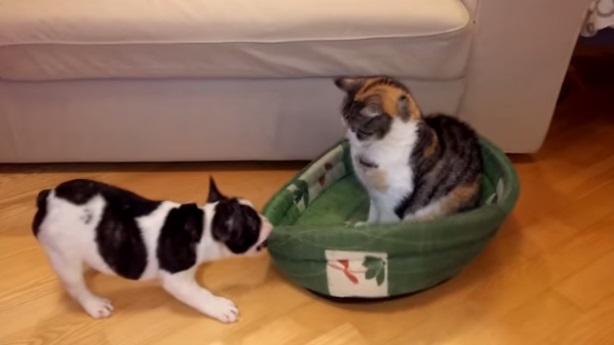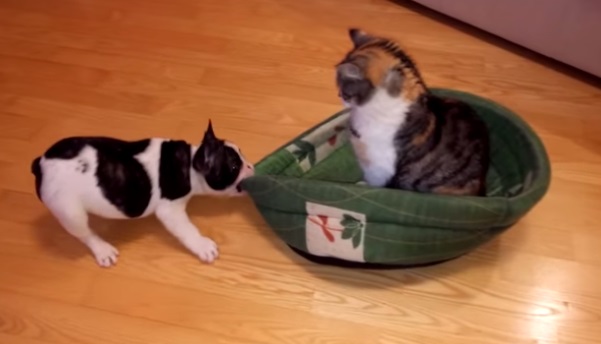 ROMA – Un cane, un gatto e una cuccia rubata. In questo video si vede come un cane tenti disperatamente di riottenere la cuccia rubata dal gatto di casa.