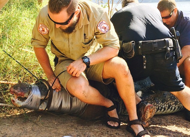 Uno dei coccodrilli presenti, era però un vero e proprio pericolo per la comunità. L’animale infatti, inseguiva i bambini e i cani della comunità a prevalenza indigena che vive nei pressi del fiume. “Molti bambini nuotano in queste acque, altri le usano per pescare” racconta Tom Nichols, uno dei guardia parchi. E così sei persone e una bella dose di tranquillanti hanno permesso la cattura del rettile che ora verrà trasferito nella Darwin Crocodile Farm . Il coccodrillo dal peso di 550 chili, è stato tirato fuori e bloccato dai sei volontari. L’alligatore è stato attirato grazie ad alcune persone che sono state usate come “cavie”.